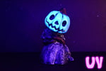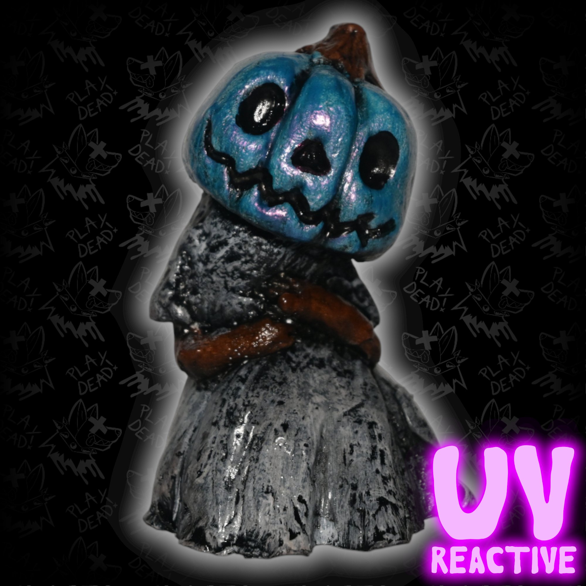 In the darkest of autumn nights, there lurks a secret... oh wait, nope, never mind, that's just Autumn herself. But hold on, she's blue now?? That's right, this color variant is essentially the opposite of our standard Autumn figure, with an added twist! The paint on her head is UV and color shift, which means not only does she glow brightly under a black light, but she also appears to take on a purple tinge from certain angles! Whether you have the original Autumn or are looking to adopt your first, this moonlight variant would love a place in your home!