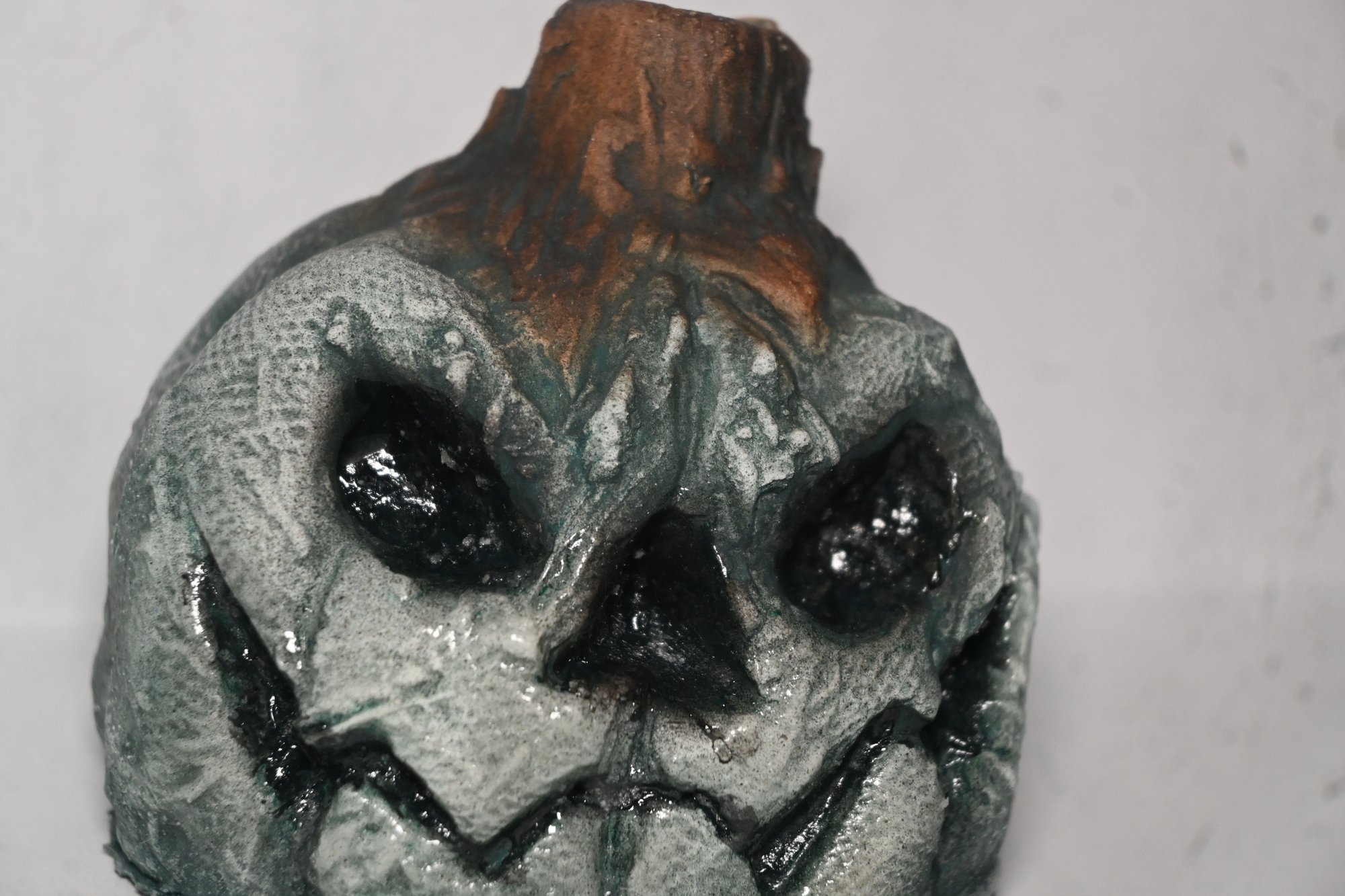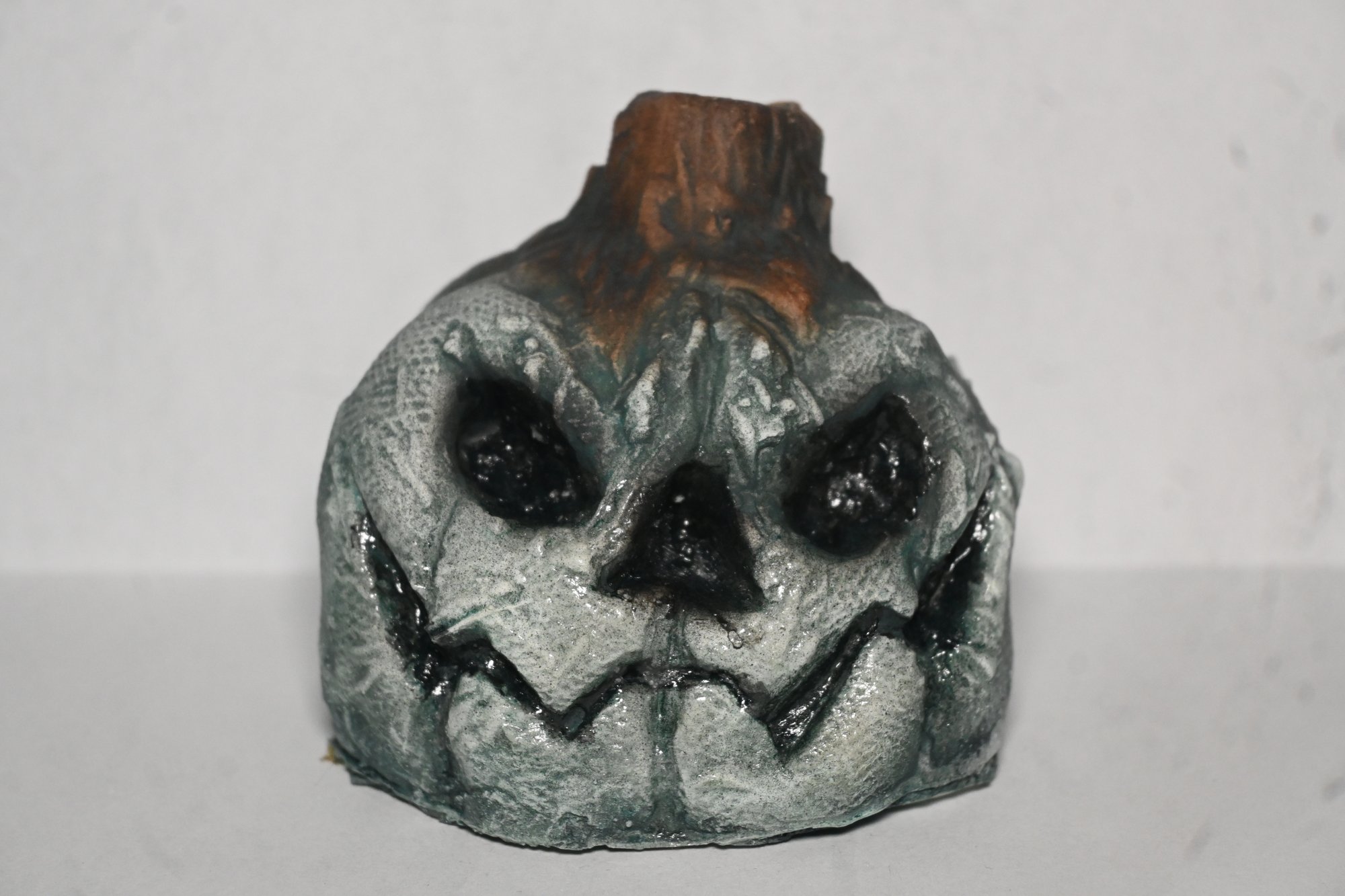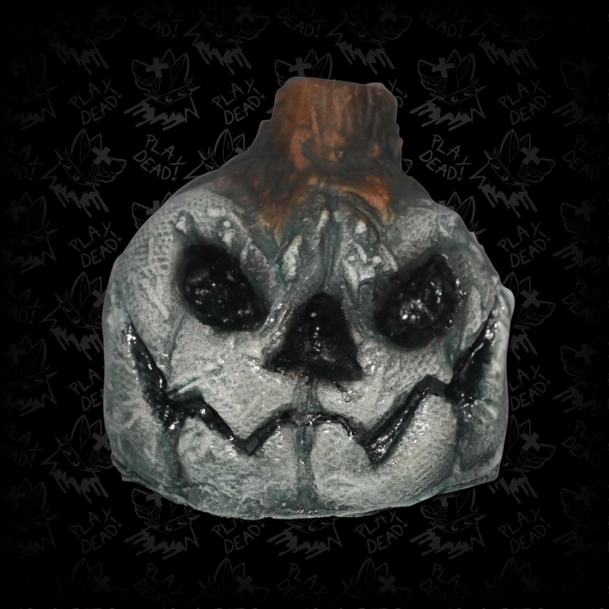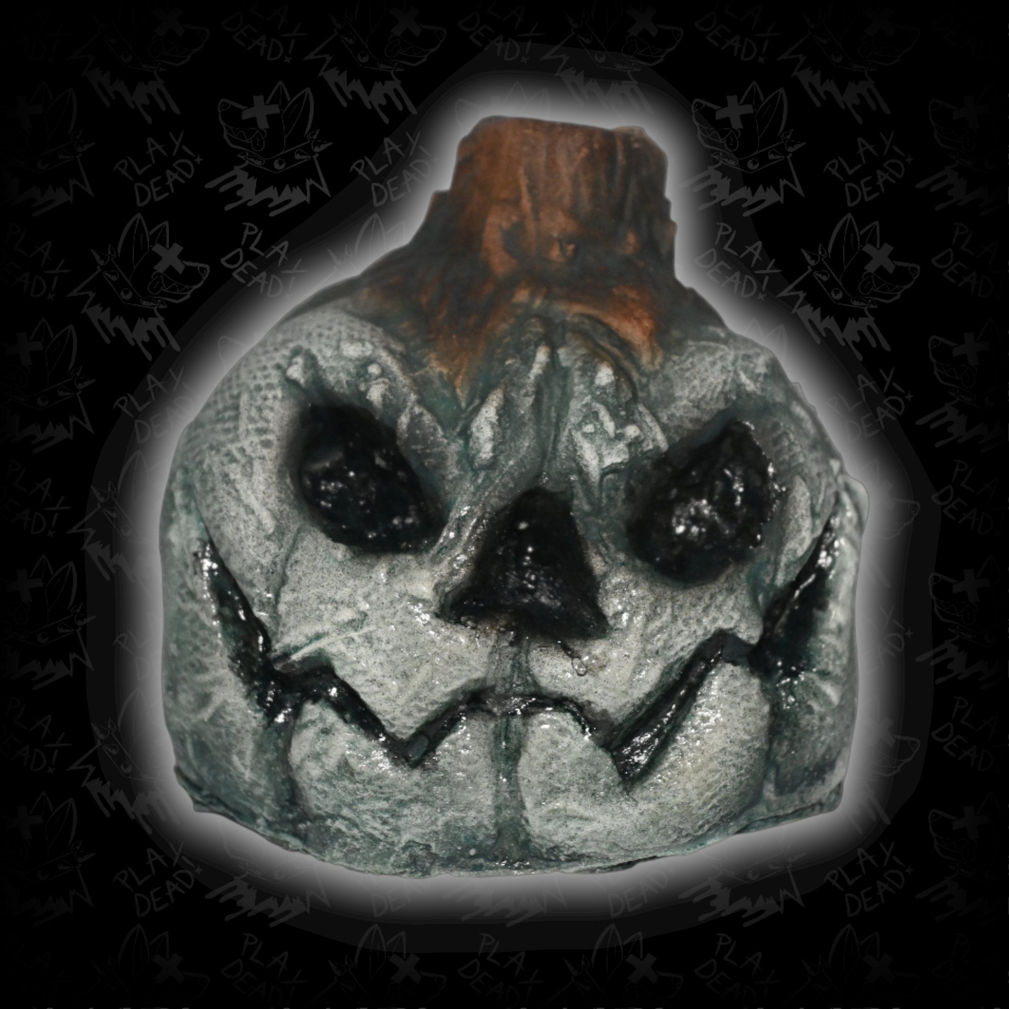 Little Jack looks a little different... new haircut maybe? Oh, wait, hold on, new paint job! This moonlight variant of our first ever product is sure to bring a chill to your collection, its giving me the shivers just thinking about it! This palm-sized pumpkin was sculpted, molded, cast, and foam filled (with your choice of either a soft or rigid urethane foam) by hand and features a unique new paint job and finish, including a Perma-Ice gloss coating on the eyes and mouth for added cool-factor. Its only available for a limited time, so add this fella to your patch today!